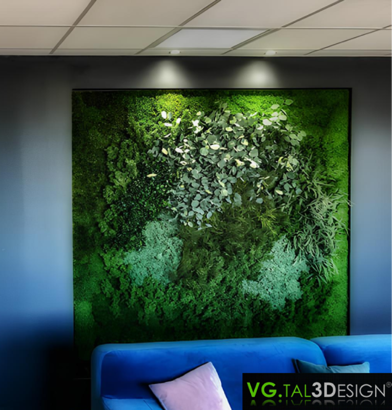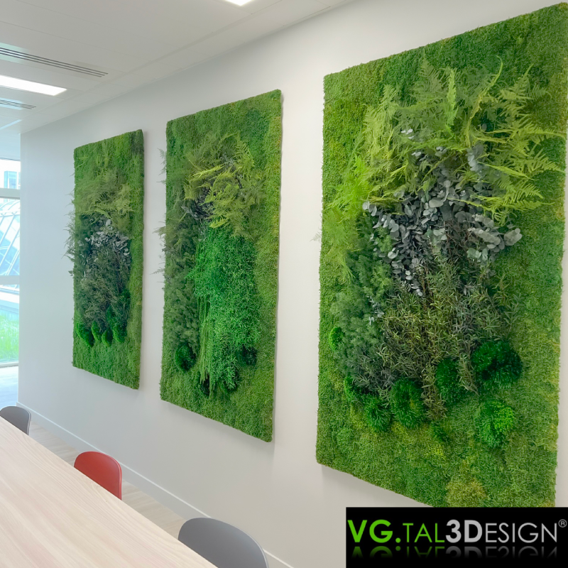 Nous avons conçu et installé trois tableaux végétaux sur mesure pour cette zone de convivialité. Composés de mousses des bois, lichen, fougères, eucalyptus et feuillages stabilisés, ils créent un relief généreux et une belle palette de verts. Accrochés en triptyque, ils rythment la pièce, améliorent le confort acoustique et apportent une sensation de nature apaisante. Réalisés dans nos ateliers puis posés sur site avec fixations invisibles, ils sont 100% sans arrosage ni entretien.