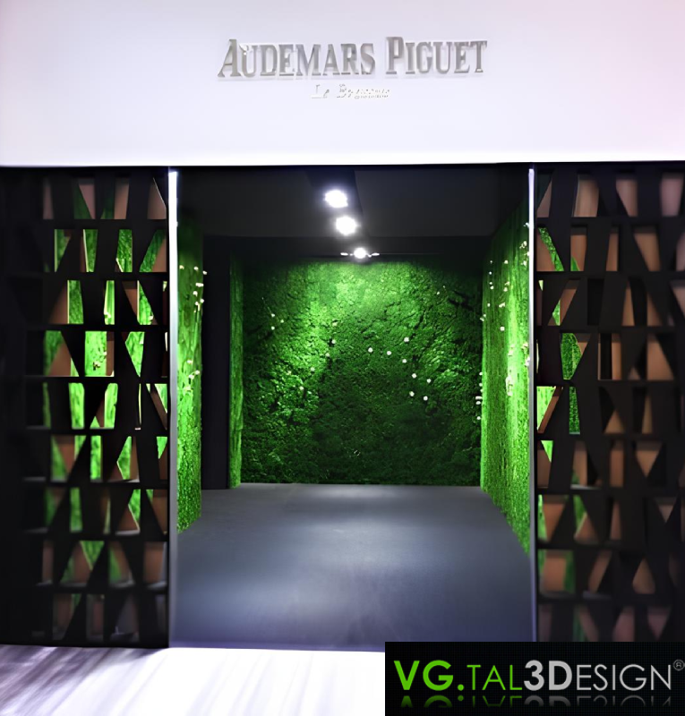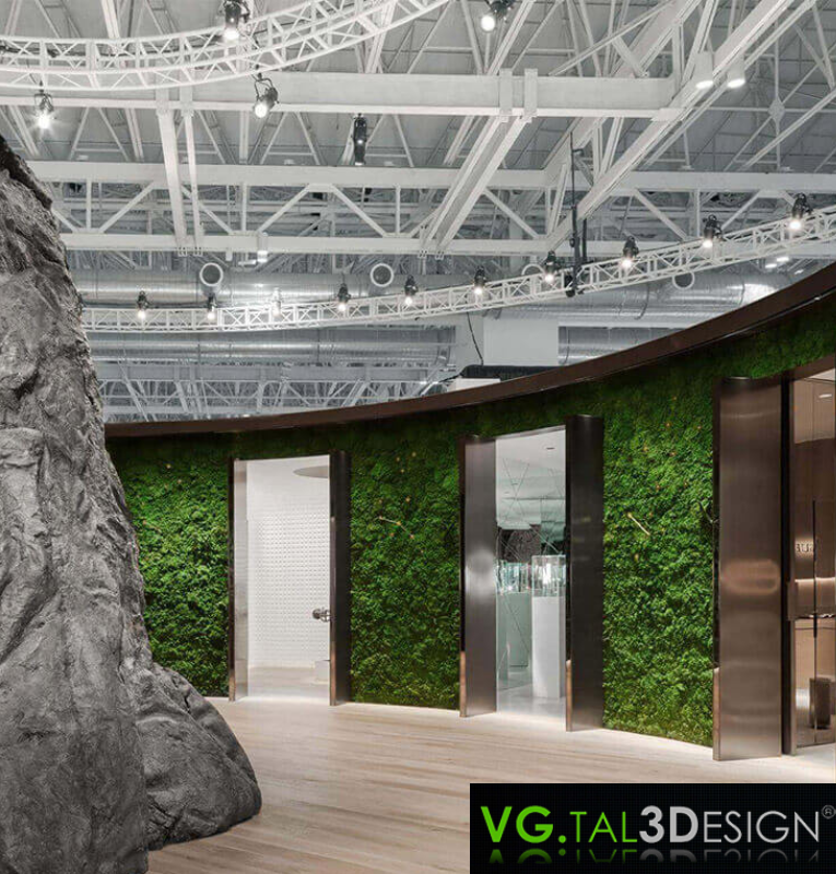 Nous avons conçu une scénographie végétale unique, mettant en place un décor vertical de mousse des bois naturalisée, intégrant des reliefs et une ambiance sonore. Inspirée des forêts suisses, parmi les plus sauvages d'Europe, cette création offre un paysage à la fois artistique et naturel. Ce projet est réalisé pour Hong-Kong, Bâle et Miami, avec une hauteur de 3,5 mètres et une longueur de 22 mètres. Un éclairage LED spécifique met en valeur l'ensemble.La conception se fait dans nos ateliers, puis l'expédition se fait par avion dans des caisses spécialement conditionnées. Le montage est assuré par nos soins, en collaboration avec nos partenaires locaux sur les trois sites.