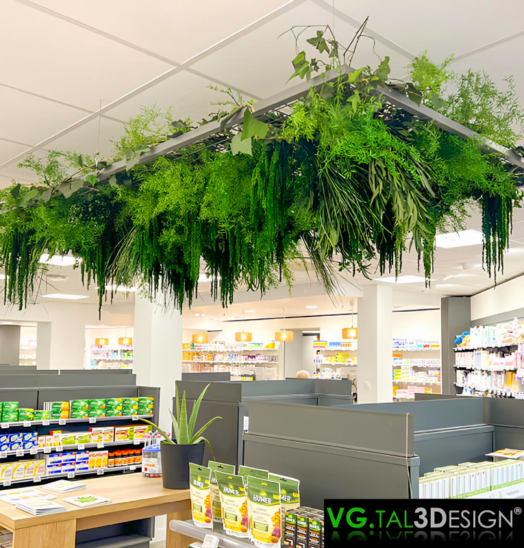 Plafond végétal pour une pharmacie, sans aucun entretien, offrant une ambiance apaisante et naturelle. Conçu pour embellir l’espace tout en améliorant le bien-être, ce plafond est réalisé sur site, suspendu à une grille pour un effet visuel unique. Ce plafond végétal est une solution idéale pour intégrer la nature dans un espace professionnel, créant ainsi un environnement agréable et revitalisant pour les clients et le personnel.