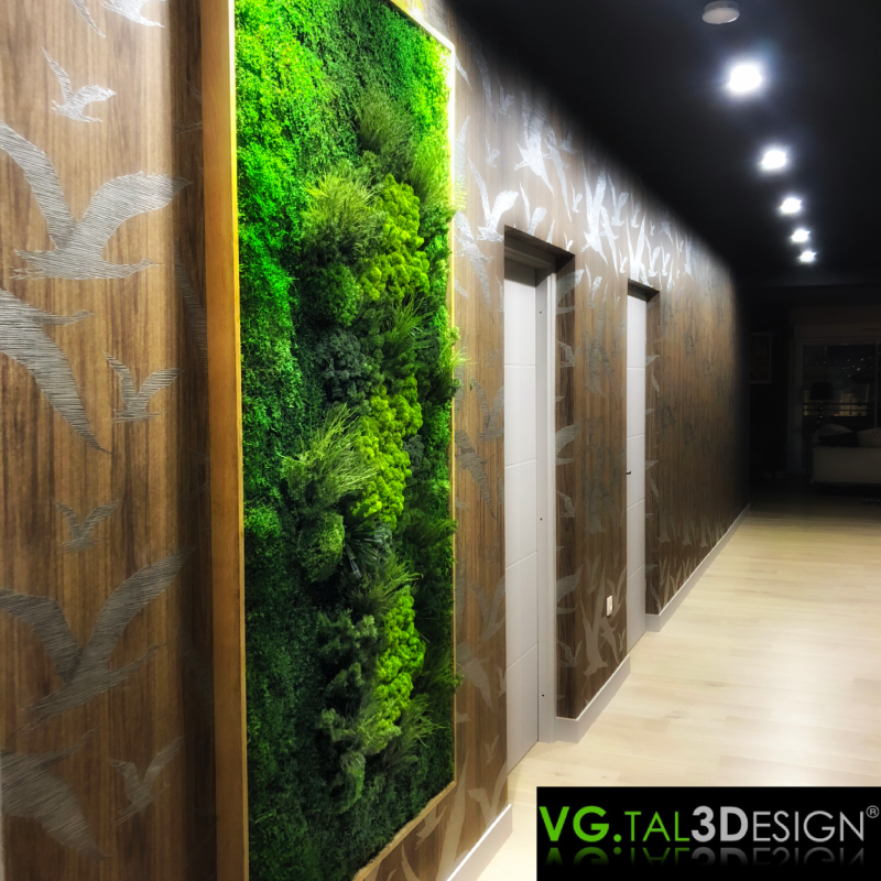Nous avons conçu et installé une fresque végétale stabilisée sur mesure pour ce couloir. Composé de mousses des bois, lichens et feuillages stabilisés, ce tableau végétal crée un relief généreux et une palette de verts vibrants. L’encadrement en bois et l’éclairage LED intégré soulignent les volumes et apportent une ambiance douce tout au long du passage. Réalisée dans nos ateliers puis posée sur site, la fresque ne nécessite ni arrosage ni entretien et améliore le confort acoustique de l’espace.